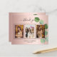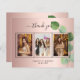 Ajoutez 3 de vos photos d'anniversaire, la taille verticale, une date, un nom et la note de remerciement. Un arrière - plan blush, rose d'or faux métallique à l'aspect avec du texte et un cadre noirs, un eucalyptus sprig. Le texte : Merci sur l'avant et votre nom sur l'arrière sont écrits avec une écriture manuscrite stylisée avec des swashes.