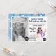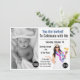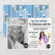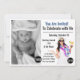 Elégante invitation photo d'anniversaire. "You Are Invited to Celebrate with Me" en police moderne. Beau design tropical avec fille en lei tenant cocktail et design abstrait bleu coloré sur le dos de la carte. Photo et détails tous changeables.