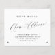Faire-part de nouveau déménagement élégant et minimaliste en calligraphie noir et blanc, budget abordable. +++++++++++ Facile à personnaliser avec votre nouvelle adresse! ++++++++++ LIRE CECI AVANT D'ACHETER ! Il s'agit d'une carte de mariage à petit budget imprimée sur une feuille de papier (chaque feuille contient une carte). ++++++ Si vous avez besoin d'enveloppes, choisissez l'OPTION ENVELOPPE. +++ Vérifiez soigneusement toutes les informations et l'orthographe de votre texte, car vous recevrez exactement ce que vous voyez - personne d'autre ne vérifiera quoi que ce soit avant l'impression. ++++ Cette carte est conçue pour une taille de 4,5 "x 5,6". Si vous choisissez une autre taille de carte et que le texte dépasse de la page, tout doit être corrigé avant d'ajouter le produit au panier.