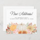 Cette carte d'annonce de déménagement à budget est décorée de citrouilles aquarelles, de feuillage d'automne et de fleurs. Elle indique "Nouvelle Adresse" dans une typographie script stylée.