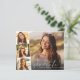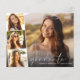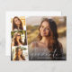 Annonce de remise de diplôme élégante et abordable avec la photo du diplômé superposée d'une bande de trois petites photos carrées, "diplômé" dans un script blanc moderne et leur nom et année de promotion en typographie blanche simple.