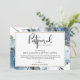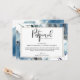 A dû reporter votre événement ? Pas de problème, informez vos invités avec cette élégante carte d'annonce de report de mariage (ou tout autre événement). Superbe tache d'aquarelle bleue avec une délicate encoche florale bleue peinte à la main contenant les détails de votre report. Fleurs et feuillage dans des tons de bleu poussiéreux, bleu marine, blanc, gris et vert sauge. Détails de typographie de script manuscrit moderne gracieux. Possibilité de l'utiliser pour n'importe quel événement. Espace pour ajouter votre propre message. Dos de carte moderne avec tache d'aquarelle bleue. Fait partie de notre collection de mariage et d'événements "Rustic Blue Mountains".