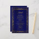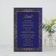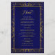 Le menu mariage est composé d'un cadre géométrique doré antique, d'un arrière - plan bleu royal et d'un élégant script d'or antique.