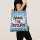 "Bring The Popcorn" est un design de texte mignon en bleu clair avec du texte en noir et rouge, avec une forme d'accent blanc et des points blancs texturés blancs.