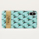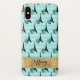 Cet élégant Coque à fleurs bleu, noir et or à peine There i iPhone X Coque a un ton sur ton aqua bleu arlequin motif en diamant avec un motif de la Tour Eiffel noir sur le dessus qui ont des fleurs bleues taillées dans l'or à leur base. Le coque a une large bande d'or en bas qui est personnalisée avec un nom ou un autre texte.