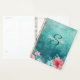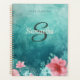 Aqua planificateur monogramme floral pour 2025 avec fleurs roses, un aperçu mensuel, et des pages hebdomadaires pour 12 mois de l'année. Monogramme avec un nom et une initiale. Personnalisez la couverture avant et choisissez entre une couverture souple ou rigide et une spirale dorée, noire ou blanche.