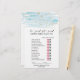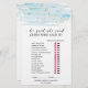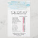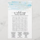 Ce jeu de recherche de mots mariage d'aquarelle bleu et or est parfait pour une douche nuptiale élégante. Le devant de la carte de jeu comporte "il a dit qu'elle a dit", ce qui est un quiz amusant sur la mariée et le marié. Le verso de la carte contient un mot de recherche avec des mots et des phrases mariages. Le design luxueux est doté d'une texture d'aquarelle bleu clair avec un éclat de belle parties scintillant faux or et une police de script de calligraphie moderne. Personnalisez la carte de jeu avec le nom de la mariée et la date de la douche nuptiale. Remarque : Ce design ne comporte pas de véritable parties scintillant en or. C'est un graphisme de haute qualité fait pour ressembler à l'or pétillant.
