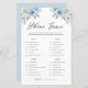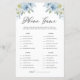Qu'y a-t-il sur ton téléphone ? Ajoutez cette carte de jeu de douche botanique à votre événement. Il présente des illustrations aquarelle de roses blancs et bleus et des pivoines avec un accent verdoyant. Personnalisez en ajoutant des textes. Cette carte de jeu de téléphone à fleurs est parfaite pour les douches nuptiales et les baby showers.