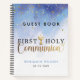 Livre d'or moderne et élégant de la Première Sainte Communion. Design avec arrière - plan aquarelle et confetti d'or, premier script de communion sacrée en lettrage tendance. Personnalisez avec un nom et une date.