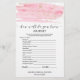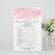 Ce jeu d'aquarelle blush & gold "What's in your purse" est parfait pour une douche nuptiale romantique et douce moderne. Le devant de la carte de jeu comporte "comment connaissez-vous bien la mariée", et le dos de la carte contient "ce qui est dans votre sac à main". Le design féminin luxueux est doté d'une texture d'aquarelle rose pâle avec un éclat de poussière de parties scintillant en faux or et une police de script de calligraphie élégante. Remarque : Ce design ne comporte pas de véritable parties scintillant en or. C'est un graphisme de haute qualité fait pour ressembler à l'or pétillant. Personnalisez l'avant de la carte avec le nom de l'épouse et la date de la douche de l'épouse. Conçu avec soin par Miriam à Fresh & Yummy Paperie. Pour la coordination des articles, veuillez visiter mon magasin Zazzle :