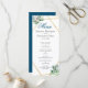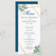 Des fleurs d'aquarelle bleu, rose et blanc de saumons boho dans un cadre doré double géométrique arborent des fleurs botaniques et de baies. Customisez ce menu mariage géométrique avec vos propres couleurs et polices ou gardez cette typographie populaire comme il est pour votre commodité. MIx et correspondent à d'autres objets de cette belle collection mariage.