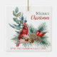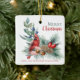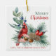 Aquarelle cardinal joyeux ornement de Noël. Belle aquarelle cardinale perchée sur une branche de pin avec des cônes de pin, des baies rouges et des glands. Les champs nom et texte sont personnalisables avec votre nom et votre salutation, si désiré. Vous pouvez acheter des cadeaux de Noël plus personnalisés dans la Collection Cadeaux de Noël personnalisée sur le Magasin Magnifiquement Abstrait.