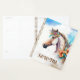 Une belle aquarelle peinte de la tête d'un cheval blanc avec une crinière beige brun remplie de jolis roses violets ; hibiscus orange et feuilles de feuillage dressés contre un arrière - plan blanc foncé. L'équine est encadrée par des nuages bleus doux et capricieux et un modèle pour votre nom apparaît en bas dans une police brune fluide avec une fausse ombre portée rose. Idéal pour les amateurs de chevaux et les passionnés d'équitation.