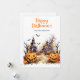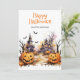 Carte d'Halloween aquarelle avec des citrouilles riants, des chauves-souris et un manoir hanté. Personnalisez facilement cette belle carte d'Halloween avec votre nom de famille et votre texte.