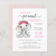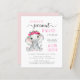 Une mignonne invitation à la douche pour petite fille à petit budget avec "Our Sweet Little Peanut Is On Her Way" écrite dans un mélange de typographie rose et gris mou et un joli script avec des swashes, et une aquarelle d'un éléphant pour petite fille avec une couronne de fleurs roses sur la tête. Personnalisez facilement les noms du bébé et de la mère dans la typographie rose et les détails de la douche dans la typographie grise moderne simple
