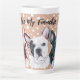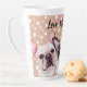 Tasse en latte de bulldog française avec trois frenchies d'aquarelle avec un arrière - plan arrière - plan à point orange. Un cadeau parfait pour un éleveur français de Bulldog ou quelqu'un qui possède et aime les frenchies. Le texte peut être modifié.
