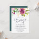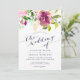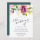 Élégante et moderne, la faire-part de mariage fleurie est ornée d'un bouquet de fleurs d'aquarelle vives et colorées, dans les tons violet, bordeaux, crème et rougis, avec des feuilles botaniques verdoyants. Personnalisez avec vos détails mariages dans une élégante typographie bleue de minuit avec des accents de calligraphie moderne. Cartes inversées à vert jasper solide.