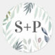 Des autocollants de mariage vert feuillage personnalisés avec vos initiales à utiliser sur les scellés d'enveloppe ou des faveurs de fête pour votre mariage. © Mini Moi Prints