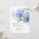 Moderne et élégant. Cette belle carte simple à plat dispose d'un bouquet floral d'hydrangées bleues fraîches en pleine floraison, contre des accents d'aquarelle bleue. Un ensemble de polices contemporaines crée un ton moderne et frais.