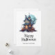 Belle carte d'Halloween avec une maison hantée, citrouilles et la pleine Lune. Personnalisez facilement cette carte d'Halloween aquarelle avec votre nom de famille et votre texte.