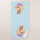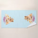 Serviette avec un joli tableau aquarelle d'un lion mère tenant son bébé. Un joli bouquet fleuri violet en dessous ajoute une touche douce à cette image douce et adorable. Arrière - plan bleu clair.