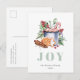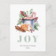 Cette carte postale de vacances douillette présente une aquarelle illustrant les gâteries traditionnelles de Noël, dont une tasse de chocolat chaud, un sucre de canne, une orange, un paquet de bâtons de cannelle, et un biscuit dépoli en forme d'étoile, décoré de feuilles saints et de baies. Le mot "JOY" apparaît dans de grandes lettres bleu-vert pâle, serif, qui se coordonnent avec la verdure. Ajoutez le nom de votre famille et l'année en italique gris charbon, ainsi que votre adresse de retour au verso.