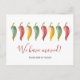 Une carte postale moderne et mobile qui permet aux amis et à la famille de connaître votre nouvelle maison douce! Ce design présente mes piments d'aquarelle d'origine avec les mots "We've Moved" dans un texte rouge riche. Utilisez les champs modèle pour ajouter votre entrée personnalisée, votre nouvelle adresse et vos noms. Un choix unique et branché à envoyer à des amis et à la famille pour que les amis et la famille connaissent votre changement d'adresse. Vous recherchez un fichier numérique ? Je peux aider. Convo me for details. Art et design de Victoria Grigaliunas. Pour en savoir plus, visitez www.zazzle.com/dotellabelle