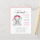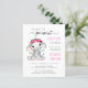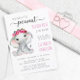 Une invitation à la douche pour petite fille économique avec "Our Sweet Little Peanut Is On Her Way" écrite dans un mélange de typographie rose et gris doux et un joli script avec des swashes, et une jolie aquarelle d'un éléphant pour petite fille avec une couronne de fleurs roses sur la tête. Personnalisez les noms du bébé et de la future mère en typographie rose et les détails de la douche en typographie gris moderne.