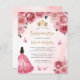 Cette jolie invitation de quinceañera comporte une bordure de roses roses roses sur un arrière - plan d'aquarelle rose. Une tiara dorée, une brune en robe de princesse rose et de petits papillons roses décorent le texte. Le mot "Quinceañera" et le nom de l'invité d'honneur apparaissent dans un élégant script d'écriture manuscrite de couleur or, avec le texte restant en gris sans serif.
