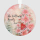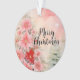 Aquarelle rose vintage Poinsettia Arbre de Noël Ornement en céramique. Une belle scène douce créée avec des fleurs rose et rouge empilées avec des arbres de Noël légèrement flous et enneigés dans l'arrière - plan finie par un ciel rose ombragé. Le devis avant modifiable dit : Joyeux Noël et à l'arrière vous pouvez entrer votre nom de famille et l'année.