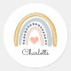Autocollants à l'arc-en-ciel boho personnalisés mignons, avec une moutarde rose et un arc-en-ciel bleu avec coeur rose au milieu et nom.