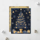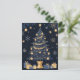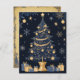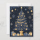 Cette carte de Noël magnifiquement conçue comprend un sapin de Noël élégamment décoré avec des ornements dorés et des lumières, surmonté d'une étoile dorée brillante. L'arbre se dresse en évidence contre un arrière - plan foncé avec des motifs de feuilles subtils et de petites étoiles dorées qui l'entourent. En bas, "Joyeux Noël" est écrit dans un élégant script doré. L'avant de la carte capte l'esprit festif avec son design complexe et festif. Sur le dos, la carte présente une page vierge de style vintage avec des flocons de neige décoratifs, offrant un espace suffisant pour écrire un message personnel et sincère. Parfait pour envoyer des voeux de vacances chaudes à des proches.