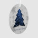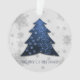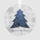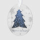 Décorez votre arbre cette saison de vacances avec un ornement d'arbre de Noël Festif Bleu. Le design ornemental est orné d'un sapin de Noël vibrant et festif, orné de flocons de neige gris et blancs en chute, et d'un accueil de fête. Autres cadeaux et objets de vacances disponibles avec ce design aussi.