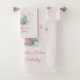 Une jolie serviette de bain rose sertie d'un camion rose rétro chargé d'un sapin de Noël et de cadeaux. Délicat rose et vert avec une chute de neige descendant Texte personnalisable rose