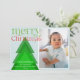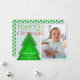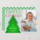 Carte de Noël moderne simple avec une seule photo encadrée dans une bordure blanche sur un arrière - plan bleu pâle. Un arbre de Noël géométrique simple aux teintes vertes mélangées apporte un détail unique. Un "Joyeux Noël" vert et rouge vif, en police de caractère, avec quelques fleurs festives. Personnalisez avec un bref message et vos noms, et l'année. Le dos de la carte comporte un motif arboré dans un jeu de couleurs assorti.