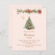 Une invitation hivernale pour une fête de Noël. Un arrière - plan crème douce, beige à l'avant décoré d'un pin dessiné à la main couleur de l'eau avec des ornements rouges et dorés. Quelques étoiles et une guirlande décorée de Noël avec des cônes et des fleurs de Poinsettia rouges. Personnalisez et ajoutez les détails de votre fête. Texte doré. 1 feuille = 1 invite imprimé bord à bord.