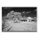 Photographie infrarouge noir et blanc d'une grange, d'un arbre et d'une clôture dans un ranch du sud du Texas.