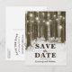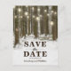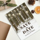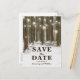 Monde rustique de Noël merveilleux, cartes postales pour annoncer la date de votre mariage avec un cadre romantique de forêt enneigée en hiver, guirlandes lumineuses, cœur sculpté dans le tronc d'un arbre, vos initiales et un modèle moderne pour annoncer la date de votre mariage.