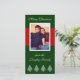 Carte simple et élégante sur arrière - plan rouge et vert avec une ligne d'arbres de Noël à motifs blancs le long du fond.