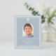 Arrière - plan bleu Dusty, décoré d'un cadre blanc, et d'une croix blanche Personnalisez et ajoutez un nom photo et des détails. Texte blanc. Cadre photo en forme d'arc. 1 feuille = 1 invite imprimé bord à bord.