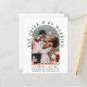 Élégant hébergement économique ou faire-part de mariage privé et réception de mariage enregistrer la date. Le devant présente votre photo de jour de mariage dans un cadre en arc et "Mangez Boire & Soyez Marié" dans la typographie serif classique. Ajoutez vos prénoms, la date de réception et l'emplacement. Au verso, personnalisez votre enregistrement des détails de la date et ajoutez vos noms dans un script de type signature.
