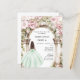 Une grande arche en marbre décorée de fleurs roses. Une fille avec une robe verte. Personnalisez et ajoutez un nom et des détails. 1 feuille = 1 invite imprimé bord à bord.