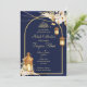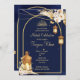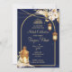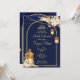 Les lanternes marocaines étoilent l'arc doré Mehndi invitation. Arrière - plan bleu foncé avec arrangements de fleurs séchées aux coins avec lanternes suspendues.