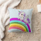 Mignons, colorés, oreiller de lancer de fille fait en bleu pâle clair, avec des dessins animés d'une licorne violette volant sur un arc-en-ciel. Customisez d'ajouter votre propre texte.