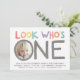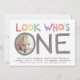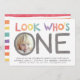 Invitations Rainbow 1er anniversaire avec l'aquarelle colorée "Look Who's One" avec une photo et un texte personnalisé. Le dos comprend un mignon motif à rayures d'aquarelle!