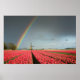 Affiche d'un arc-en-ciel coloré dans un ciel foncé au-dessus d'un moulin à vent et d'un champ rempli de tulipes rouge vif lors d'une tempête de printemps dans un paysage près d'Amsterdam dans la Pays-Bas.