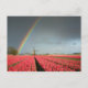 Carte postale d'un arc-en-ciel coloré dans un ciel foncé au-dessus d'un moulin à vent et d'un champ rempli de tulipes rouge vif lors d'une tempête de printemps dans un paysage près d'Amsterdam dans la Pays-Bas.