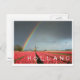 Carte postale d'un arc-en-ciel coloré dans un ciel foncé au-dessus d'un moulin à vent et d'un champ rempli de tulipes rouge vif pendant une tempête de printemps dans un paysage près d'Amsterdam dans la Pays-Bas avec un bord blanc et le texte : 'Holland'.