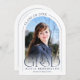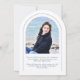 Cette faire-part de graduation minimaliste marine bleu et blanc présente une arche délicate, 2 modèles photo et une élégante typographie moderne.