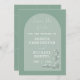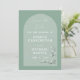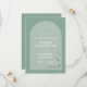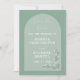 Les teintes Vert Arc Moderne Économisent La Carte Date. Teintes vertes avec arche. Polices de script et de serif. Fleurs blanches et texte blanc. Le dos a des lignes de bleu clair. Design moderne et minimaliste. Personnalisez avec vos détails mariages.